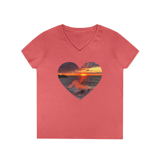 Ladies' Cotton V-Neck T-Shirt • "Fiery Splash at Avon Lake" Photo in Heart • 10 color fabric choices
