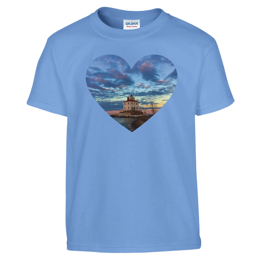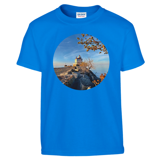 Classic Kids Crewneck T-shirt • "Breakwater Lighthouse" • 6 light color fabrics • 4 photo styles