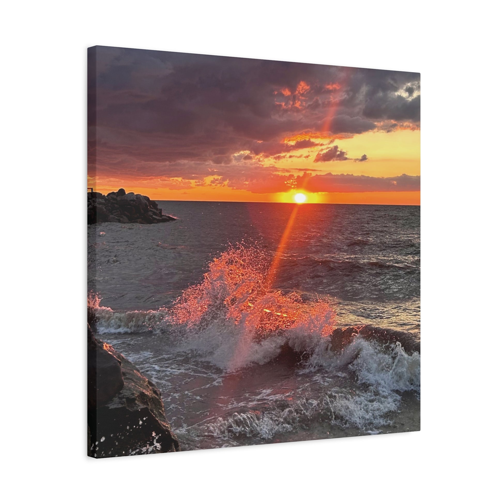 Lake Erie Obsessed original photo, "Fiery Splash at Avon Lake", on stretched canvas. Each matte canvas comes with back hanging already included for convenient placement. The 1.25 inch frame is made with profile radiata pine that is ethically sourced from renewable forests. Materials: cotton and polyester composite (canvas), pine wood (frame)
